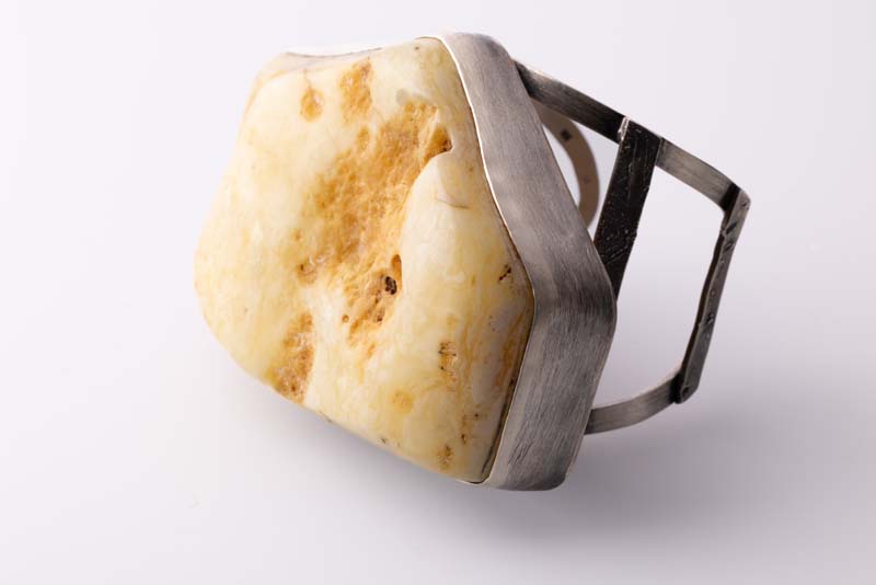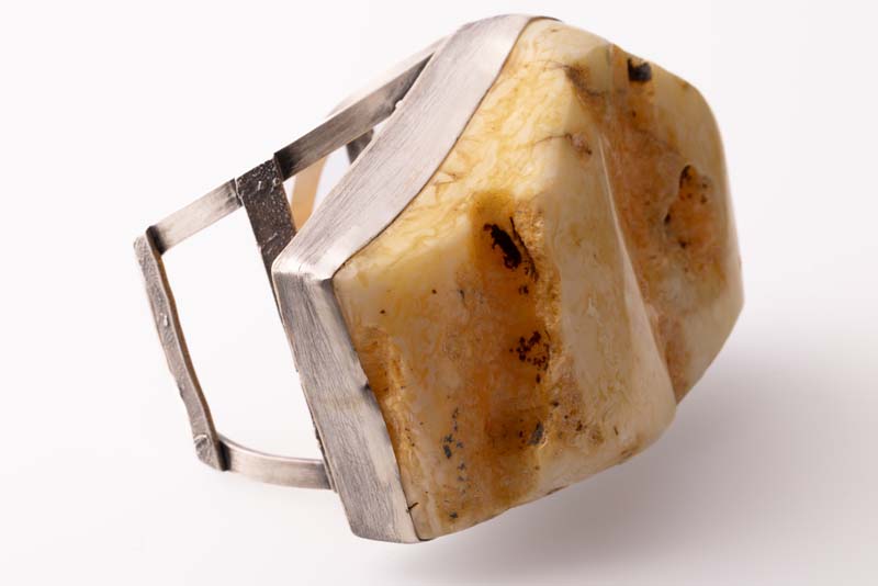 Wyrazista bransoleta stworzona ręcznie z wysokiej jakości srebra próby 925, której centralnym elementem jest ogromny, naturalny mleczny bursztyn o wyjątkowej strukturze i subtelnej, jasnej barwie. Kamień zachwyca swoją organiczną formą oraz naturalnymi przejściami kolorystycznymi, będąc prawdziwym dziełem natury ukształtowanym przez miliony lat.