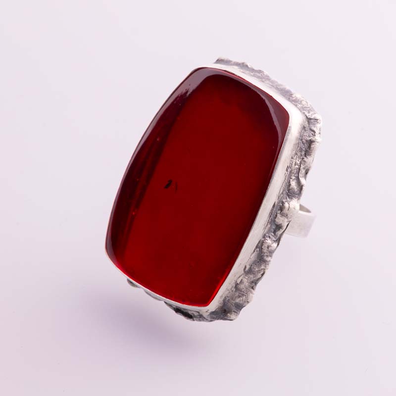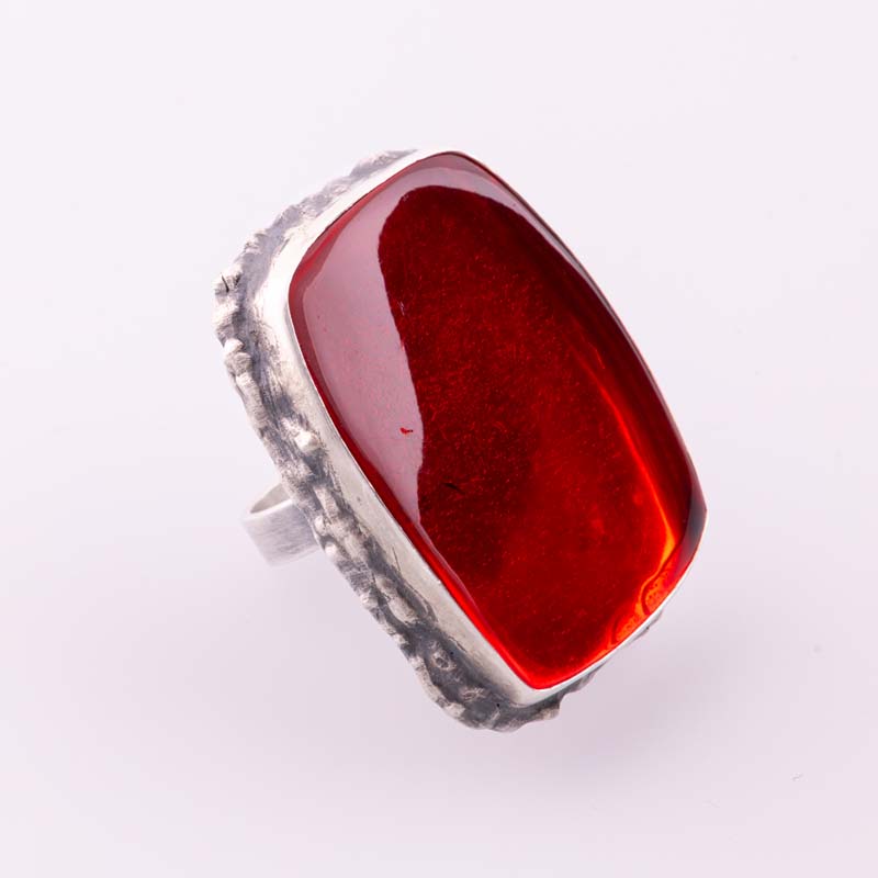 Efektowny, duży pierścionek wykonany ręcznie, który przyciąga uwagę od pierwszego spojrzenia. Jego centralnym elementem jest naturalny bursztyn bałtycki farbowany gazem, wyróżniający się intensywną barwą, głębią i charakterystycznym, organicznym rysunkiem. Każdy kamień jest niepowtarzalny, co sprawia, że pierścionek ma unikatowy charakter.