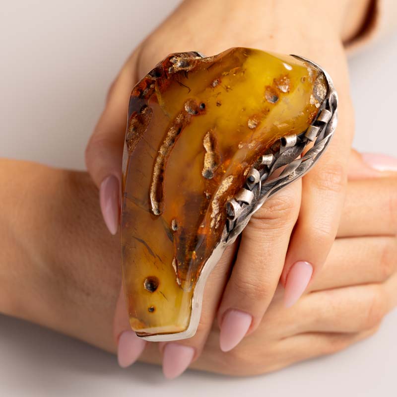 Wyjątkowy, duży pierścionek z naturalnym bursztynem, wykonany ręcznie ze srebra próby 925. Każdy egzemplarz jest unikatowy i powstaje z dbałością o najmniejszy detal, co podkreśla jego artystyczny charakter. Centralnym elementem jest starannie oszlifowany bursztyn o ciepłej, miodowej barwie, który przyciąga wzrok i nadaje biżuterii niepowtarzalnej głębi.