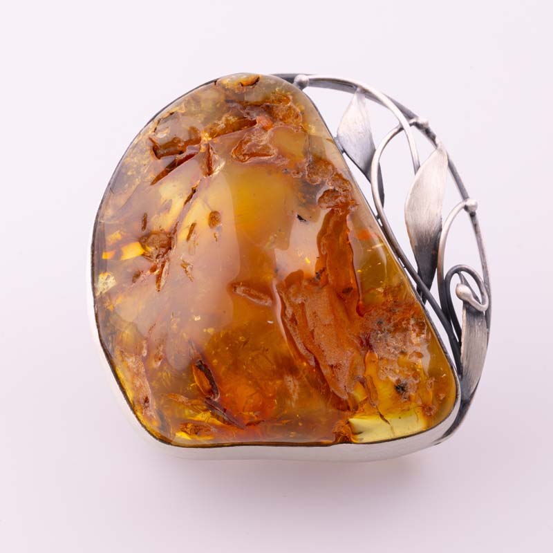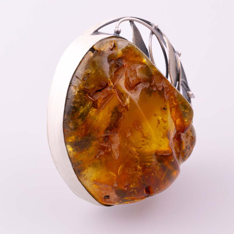 Bursztyn osadzony został w oryginalnej, artystycznej oprawie wykonanej ze srebra próby 925, ręcznie formowanej i dopracowanej w najmniejszych detalach. Dynamiczna forma srebra podkreśla monumentalny charakter pierścionka, jednocześnie harmonijnie współgrając z organiczną formą kamienia.