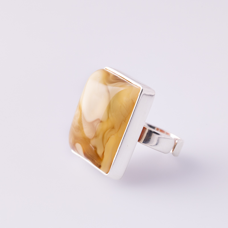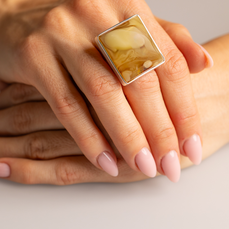 Odkryj magię natury zamkniętą w szlachetnej formie. Ten wyjątkowy pierścionek został wykonany ręcznie ze srebra próby 925 i ozdobiony unikatowym bursztynem bałtyckim z naturalnymi „chmurami” – subtelnymi, mlecznymi inkluzjami, które tworzą w kamieniu niepowtarzalny, eteryczny pejzaż.