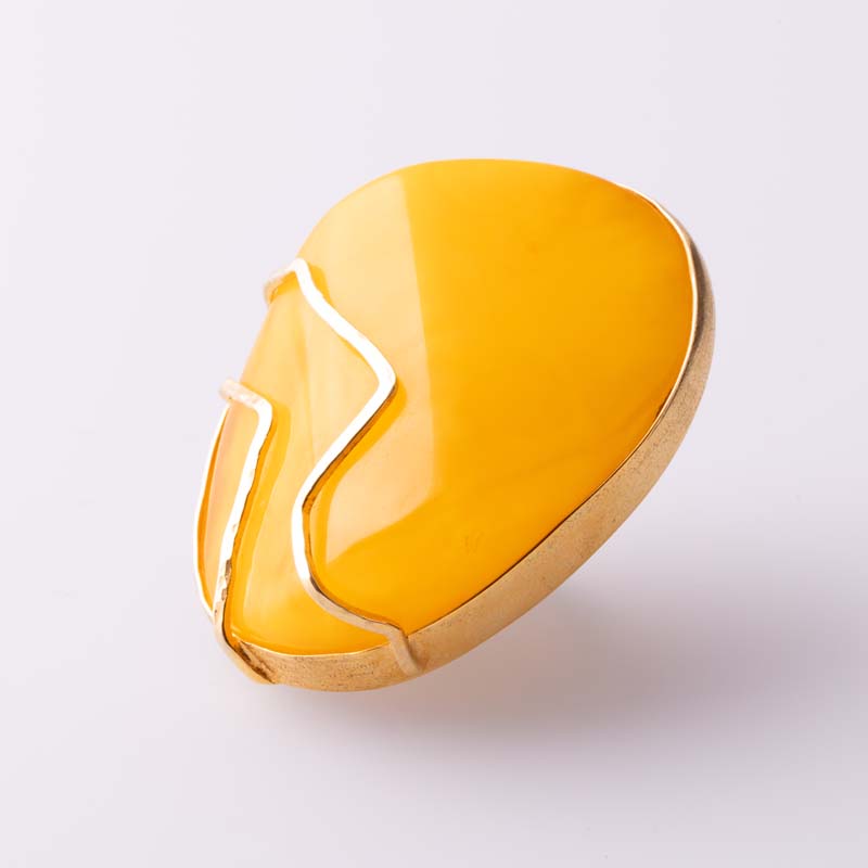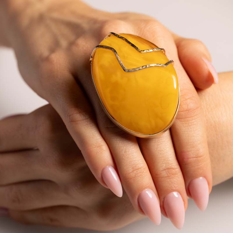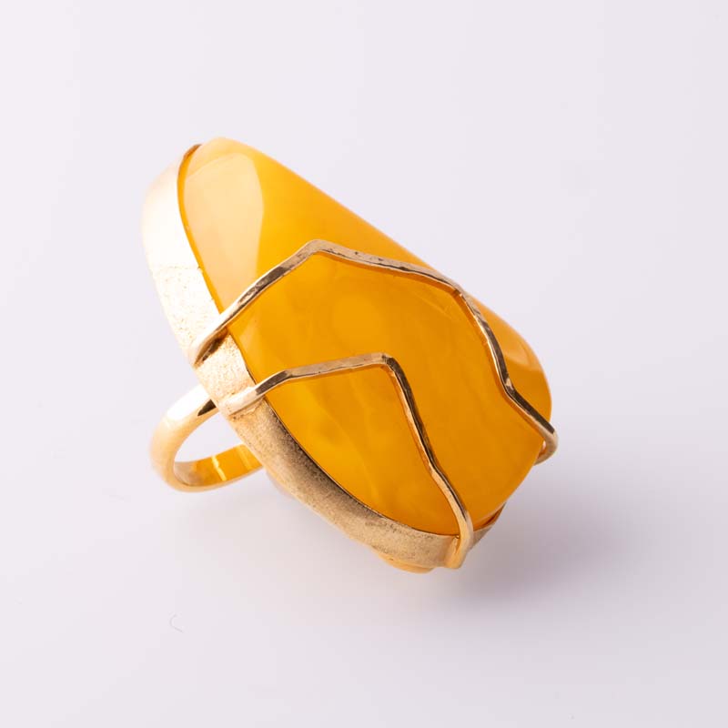Wyjątkowy pierścionek wykonany ręcznie z najwyższą starannością, łączący naturalny bursztyn bałtycki najwyższego sortu z luksusową oprawą ze srebra próby 925, pozłacanego grubą, 2-mikronową warstwą złota. Kamień zachwyca głębią koloru, naturalnymi inkluzjami i perfekcyjnym szlifem, co czyni każdy egzemplarz niepowtarzalnym.