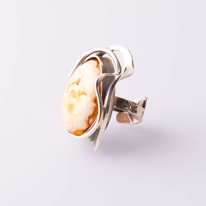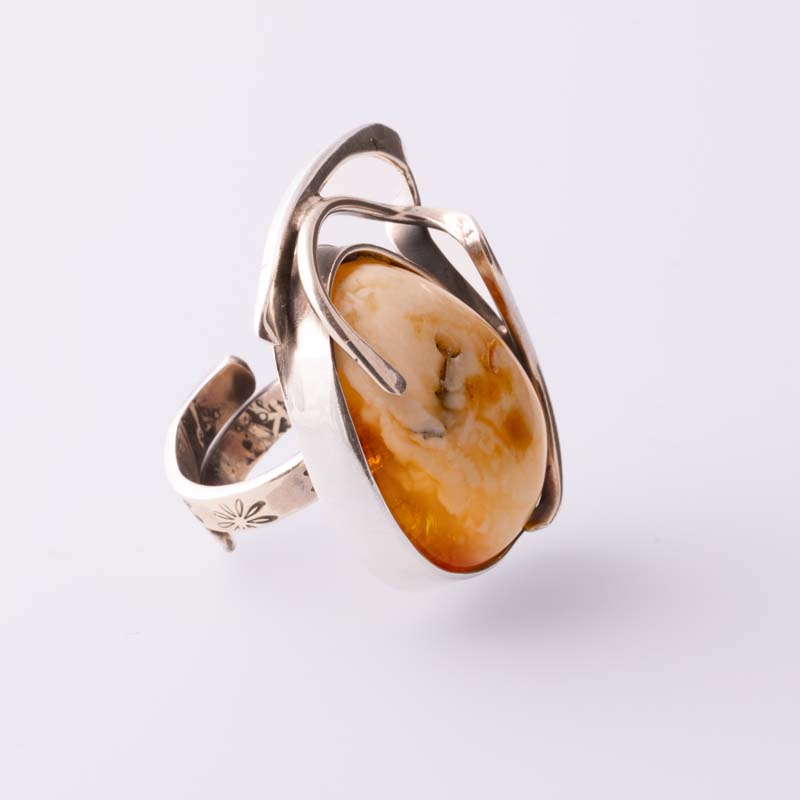 Ręczne srebrne zdobienie dodaje pierścionkowi elegancji i finezji, podkreślając naturalne piękno bursztynu oraz wyjątkowy charakter całej kompozycji. Każdy egzemplarz jest niepowtarzalny, dzięki unikalnym inkluzjom bursztynu i precyzyjnemu rzemiosłu artystycznemu.