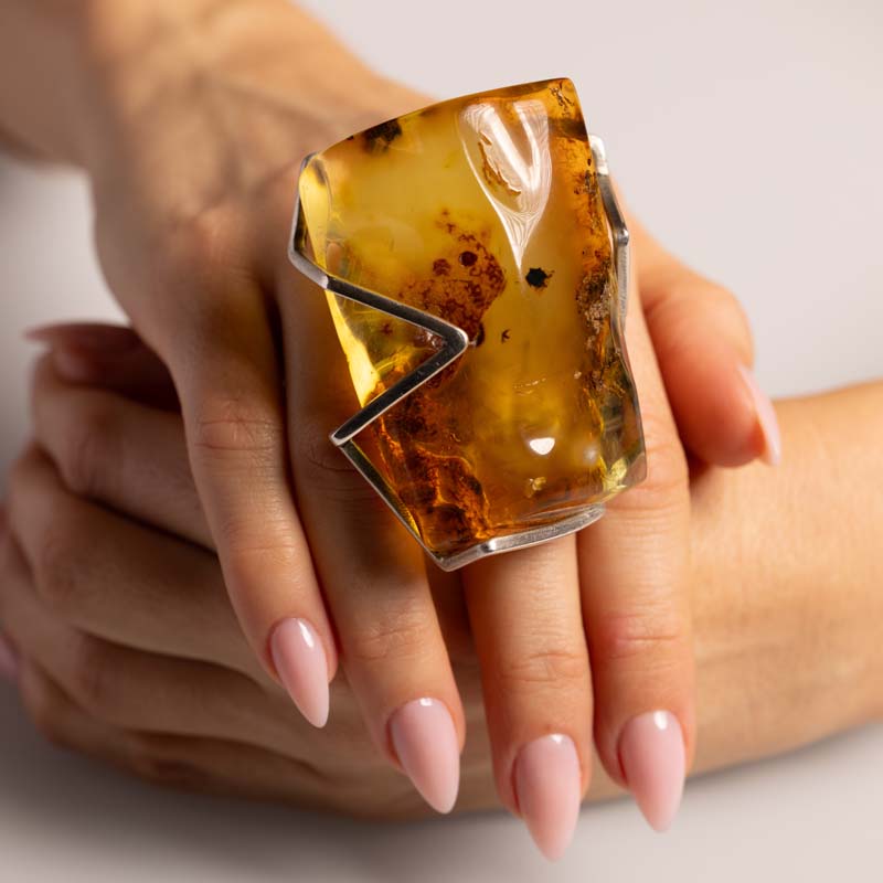 Wyjątkowy pierścionek zaprojektowany z myślą o miłośnikach wyrazistej biżuterii i naturalnych kamieni. Centralnym elementem jest naturalny bursztyn o imponujących rozmiarach, który przyciąga uwagę swoją głębią barwy, organiczną strukturą oraz unikatowymi inkluzjami powstałymi przez miliony lat.