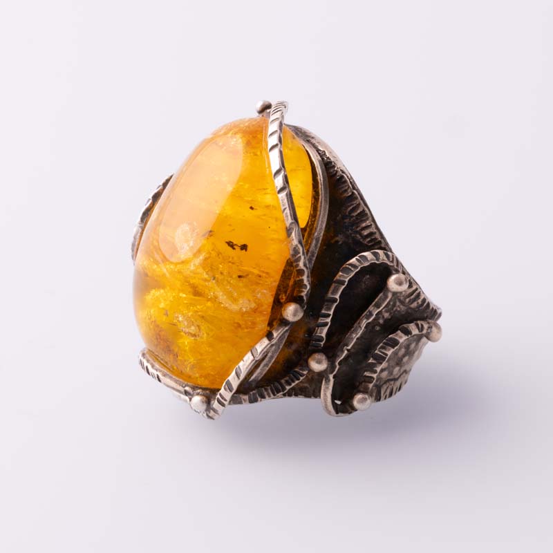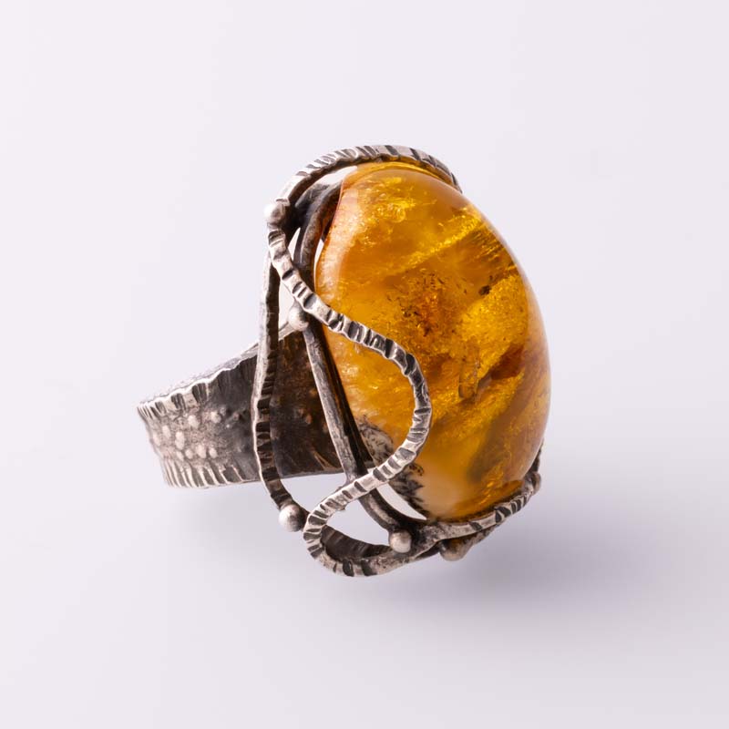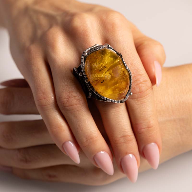Ręcznie wykonana srebrna oprawa subtelnie eksponuje bursztyn, podkreślając jego ciepłą barwę i wyjątkową fakturę. Połączenie naturalnego piękna kamienia z precyzyjnym rzemiosłem sprawia, że pierścionek jest elegancki, a jednocześnie pełen charakteru.