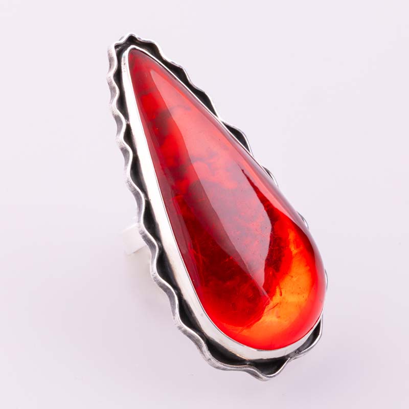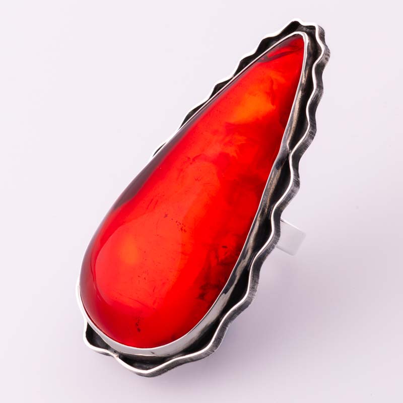 Ten ręcznie wykonany pierścionek ze srebra próby 925 zachwyca unikatowym charakterem i szlachetną formą. Jego sercem jest naturalny bursztyn, poddany procesowi barwienia gazem, który nadaje kamieniowi głębię koloru i wyjątkową, nasyconą barwę, zachowując jednocześnie jego naturalną strukturę i ciepły blask.